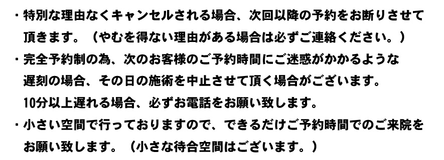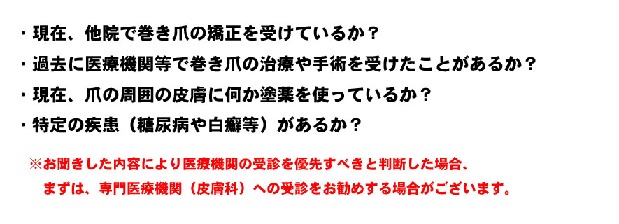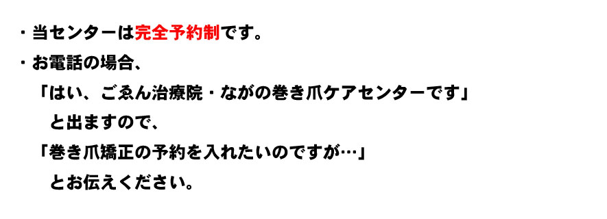一般的な常識に欠ける方(極度に横柄な態度の方、平気でうそをつくような方、時間にルーズすぎる方等)のご予約はご遠慮いただいております。矯正施術を受けて頂き、巻き爪を改善、克服していくにはお互いの信頼と協力が大事であると考えています。