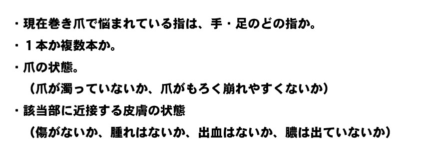 爪の色、形状、状態、爪周囲の皮膚の状態(傷の有無、腫れや出血の確認当)