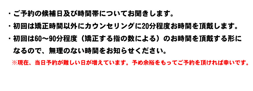 ※初回は問診等で少しお時間を頂く為、50分〜1時間を目安として下さい。