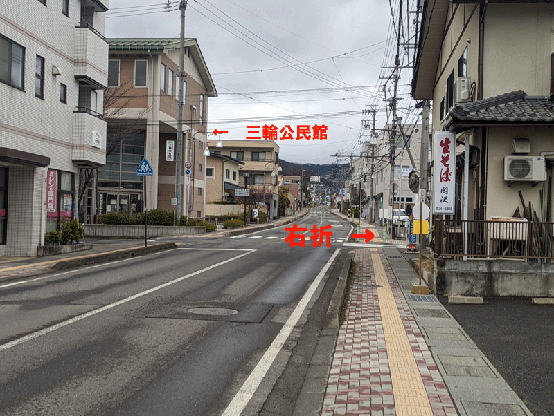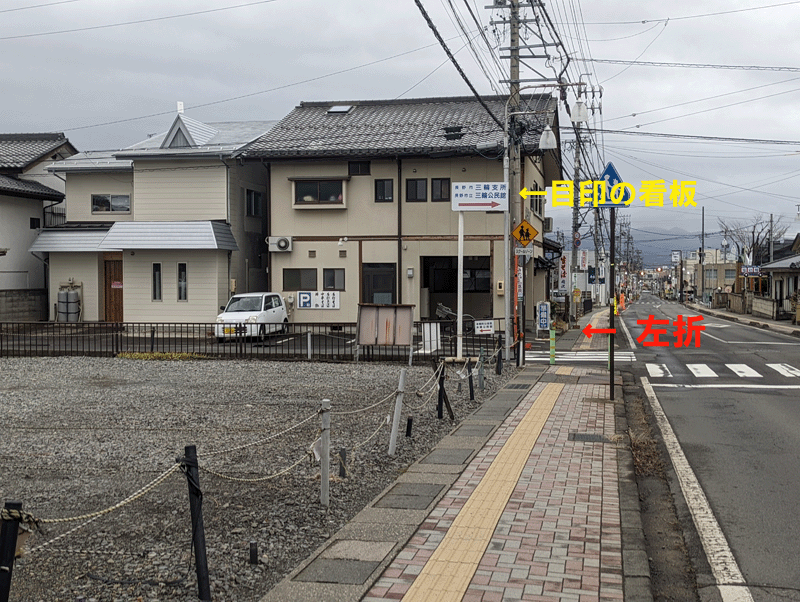 柳町交番前の交差点を長野電鉄本郷駅方面に北上、『三輪1.3.4.5丁目交差点』を直進すると右側に