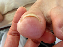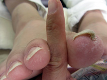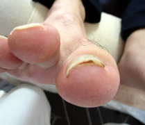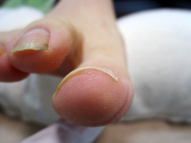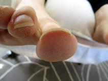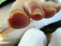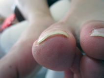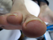 よく見たら足の指の爪が皮膚に食い込んでいるような・・・。