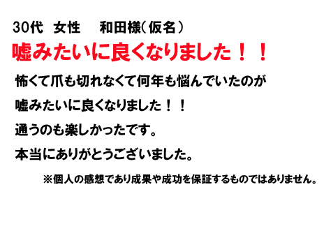 特に爪の横の皮膚に炎症等が起きていない場合には劇的に痛みの改善が見られるようです。