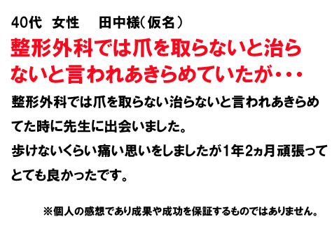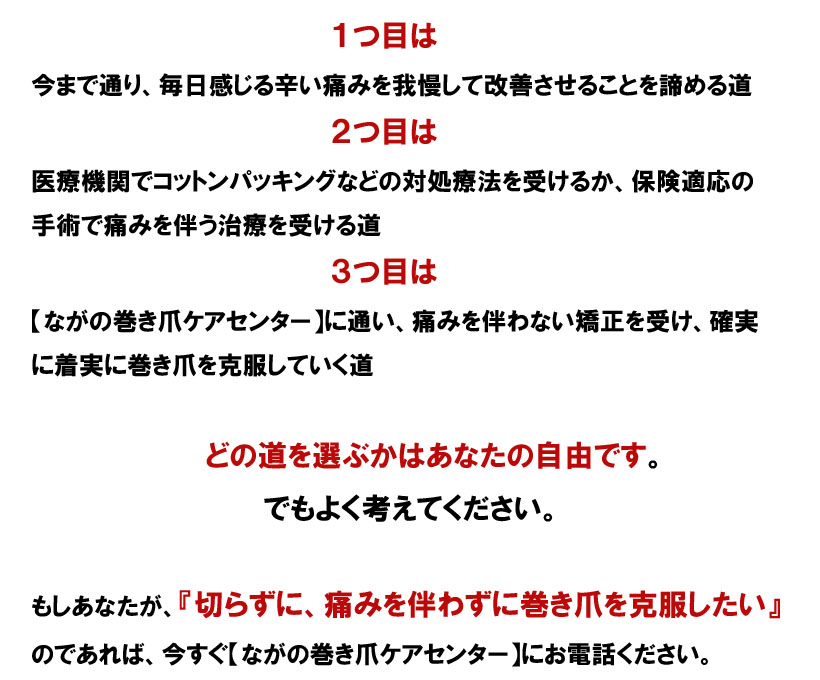 あなたが本気で『巻き爪を何とか改善して痛みから解放されたい』とお考えであれば、当センターが全力でサポートし、巻き爪の症状を改善して参ります。